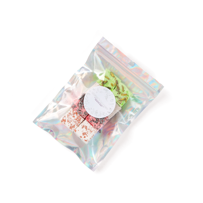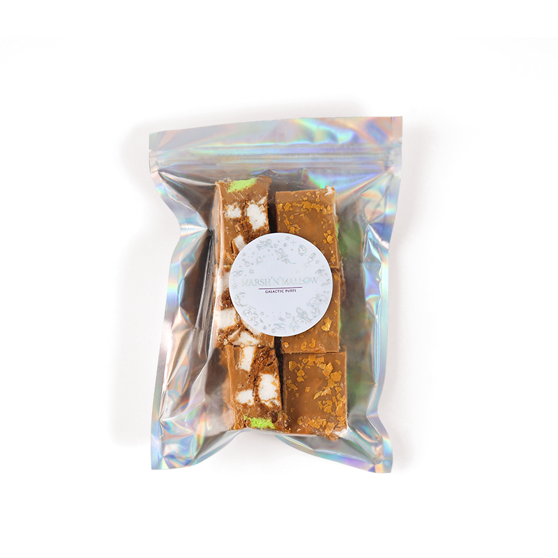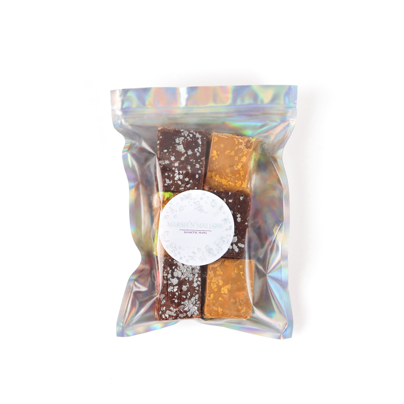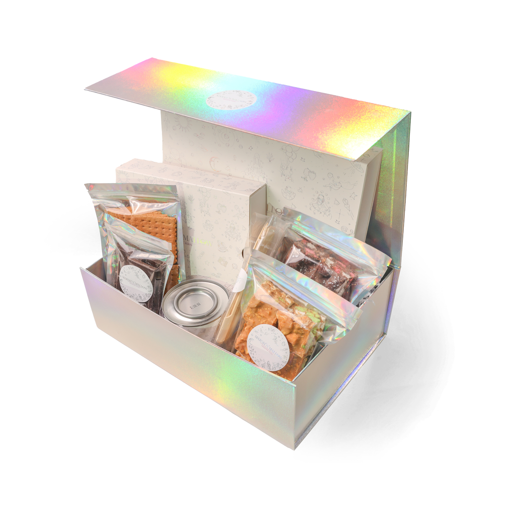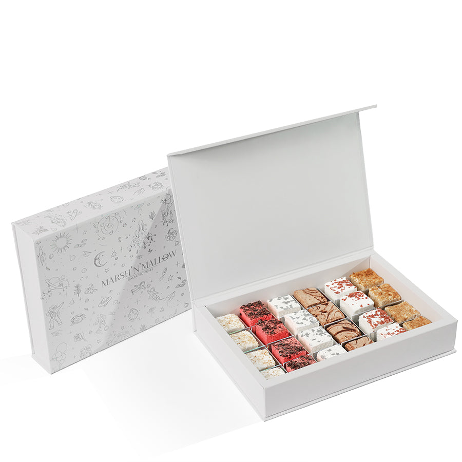 Your choice of 36 gourmet marshmallows from 15 different flavors in a premium galactic box. These marshmallows are made from natural flavorings, organic agave syrup, sugar and halal gelatin. They are low in fat, gluten free and dairy-free. Chocolate used contains dairy.