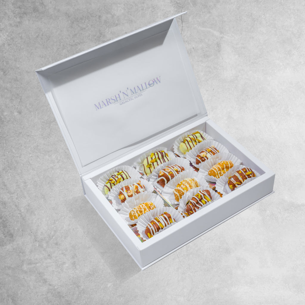 استمتعوا بصندوقنا الجالاكسي المكون من 12 قطعة من التمر المحشو بالمارشميلو، المغطى بالشوكولاتة الفاخرة الداكنة، البيضاء، وكراميل الشوكولاتة البيضاء.